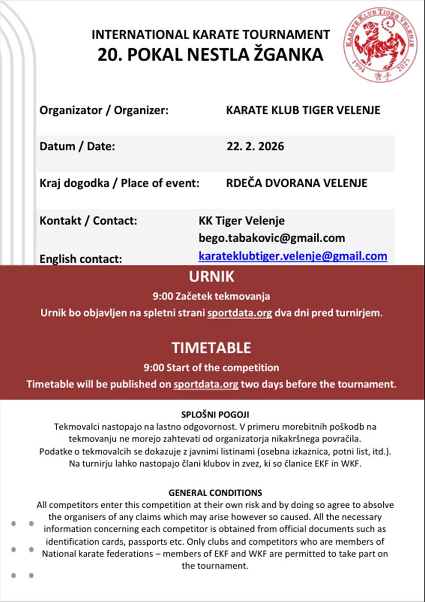 | 17.Pokal Nestla Žganka (12. 02. 2023) | V nedeljo, 12.2.2023 je v Rdeči dvorani Velenje potekal tradicionalni mednarodni turnir 17. POKAL NESTLA ŽGANKA. Organizator turnirja Karate klub Tiger Velenje že vrsto let organizira enega večjih karate turnirjev v Sloveniji. Tudi tokrat je bila mednarodna zasedba na turnirju na zavidljivi ravni. Tekmovalo je 503 oseb, od tega 222 žensk in 281 moških iz 85 klubov iz 8 držav. Poleg 370 ... | | |